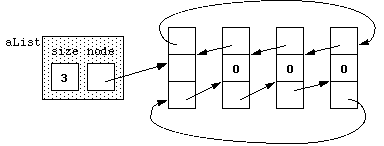 list<int> aList(3);preallocates a sequence of linked nodes, consisting of a header node and three additional nodes. These nodes can be anywhere in a program's free store of memory. We can visualize these nodes as follows:
