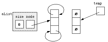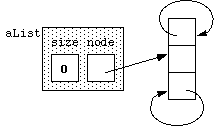list<int> aList;The structure of the list is a bit complicated, but each node in the list stores three things: a value, a pointer to the previous node (if any), and a pointer to the following node (if any). As we mentioned earlier, every list has a special first node called the head node whose previous-node pointer points to the last node in the list, and whose next-node pointer points to the first node in the list. The empty list is thus something like the following: