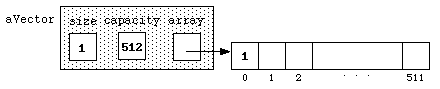 aVector.push_back(1);The push_back() function member is designed to append values in an efficient manner with respect to time. It should be evident that the push_back() function must increase the size of aVector to make room for the new value. Since this takes time, the push_back() operation preallocates a block of memory, so that subsequent calls to push_back() will not also have to increase the capacity of aVector. It then writes the new value into the next available location, giving us: