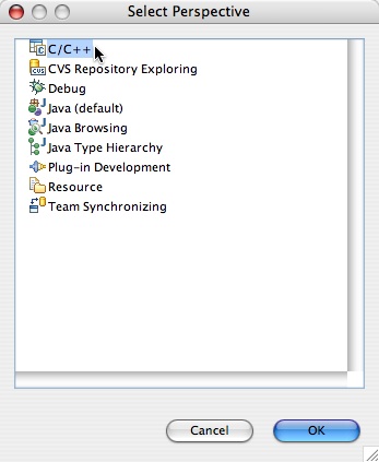 The particular arrangement of the screen is determined by what Eclipse calls a perspective. By default, Eclipse launches the Java perspective (for building Java programs), so our next task is to switch from the Java perspective to the C++ pespective.