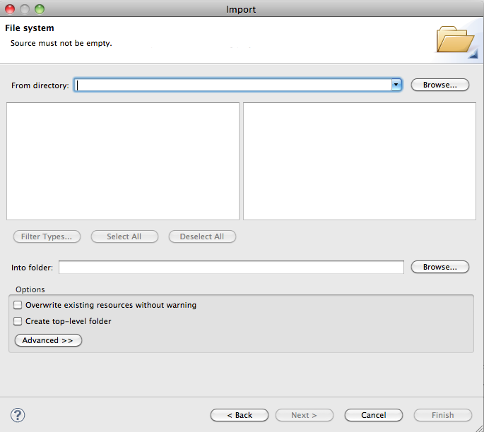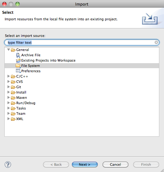 Since we are going to import an already-existing file, select General > File System as the mechanism we will use for the import. This will "undim" the Next button, so click it. This will replace the current Import dialog with a new one, shown below: