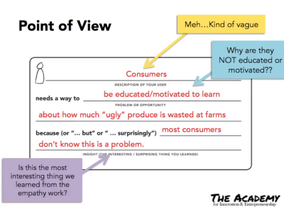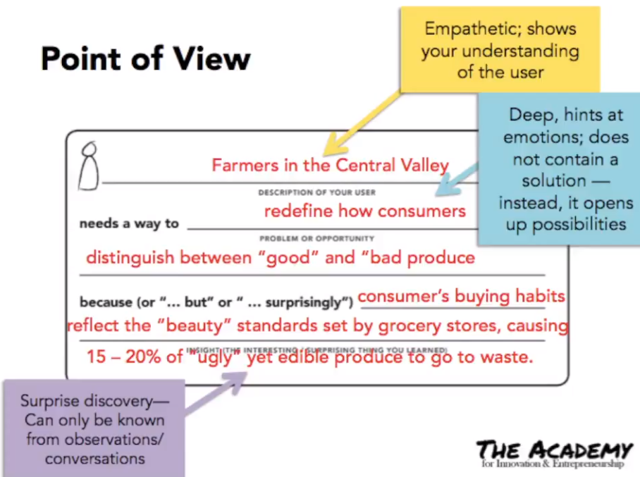 I found a great example from YouTube. Please take a look at this video that talks about POV statements of imperfectproduce.com, a recent startup that sells “ugly” shaped produce for reducing waste. I got the screenshots from the video. You can see that the first two examples are less appealing, but the last one is a very strong POV that tells the value of the service. Of course, it does not tell exactly what the service looks like. In fact, POV is just a problem statement (not a solution statement), and a strong POV helps you to generate many ideas/concepts.