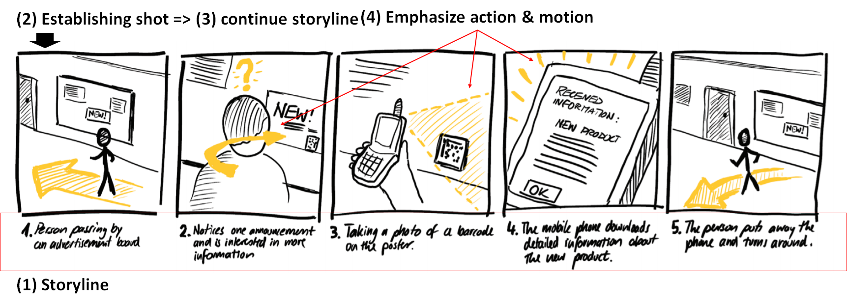 You then need to draw the first scene that introduces where the interaction takes place by illustrating the setting and people. After the first scene is set, then you can work on the following scenes as shown above. The final step is to emphasize a user’s action/motion via annotation (in yellow above), which otherwise is difficult to illustrate in a still image.