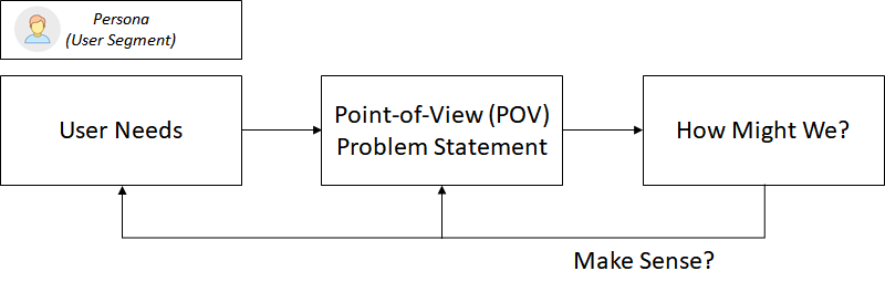 From the user's needs we define a problem statement or POV, and then start generating ideas with “HMW” as illustrated before. The above diagram is a simplification of the process (User Need to Design Challenge by Aurobinda Pradhan). As you generate new ideas, you can check whether it makes sense or not. You can always go back to POV and generate additional HMW questions. If your POV needs modification, you can also go back to user needs and revise your POV.