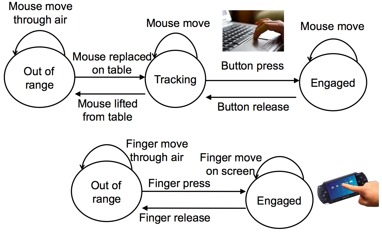 State machines are also useful for modeling and tracking low-level interaction with the pointing device itself - the mouse or touchscreen. The top state machine in this slide shows the states of a mouse or touchpad. Lifting the mouse off the table, or lifting your finger off a touchpad, is called clutching. Why do you need to clutch with a mouse or touchpad?