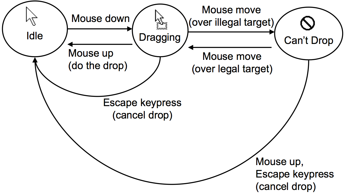 Here’s a state machine suitable for drag & drop. Notice how each state of the machine produces different visual feedback, in this case the shape of the cursor. (The pushbutton on the last page had the same property.) This is a common case in input implementation, since different states of an input controller often represent different modes from the user’s point of view, and distinguishing those modes with visual feedback helps reduce mode errors.