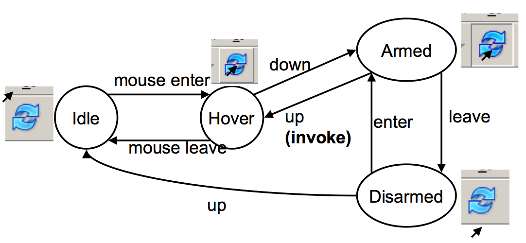 Transitions between states occur when a certain input event arrives, or sometimes when a timer times out. Each state may need different feedback displayed by the view. Changes to the model or the view occur on transitions, not states: e.g., a push button is actually invoked by the release of the mouse button.