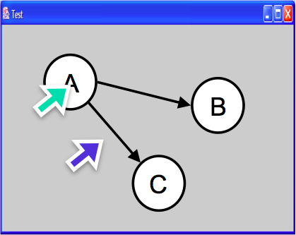 Now consider the blue mouse cursor. What component will be the initial target for a mouse-move event for this point? The answer depends on how hit testing is done by the toolkit. Some toolkits support only rectangular bounding-box hit testing, in which case Edge A-C (whose bounding box contains the mouse point) will be the event target. Other toolkits allow hit testing to be overridden and controlled by components themselves, so that Edge A-C could test whether the point actually falls on (or within some small threshold of) the actual line it draws. Java Swing supports this by overriding Component.contains(). If Edge A-C rejects the point, then the next component in z-order whose bounding box contains the mouse position is the window itself, so the event would be dispatched directly to the window.
