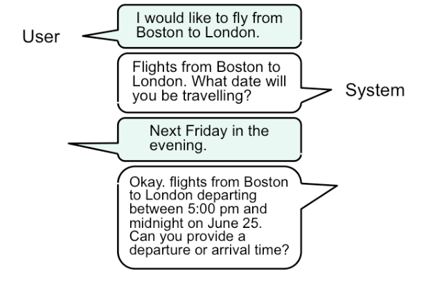 A fourth interaction style–once the province of research, but now increasingly important in real deployed apps or devices–is speech dialog in natural language. (This exchange is from the Mercury system, a flight-search system developed at MIT in the 1990s, which could be used over the phone.)