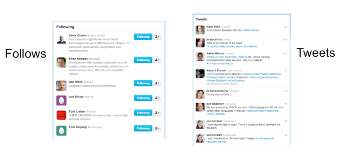 For example, at a high level, the model of Twitter is that there are other users in the system, you have a list of people that you follow and a list of people that follow you, and each user generates a stream of tweets that are seen by their followers, mixed together into a feed. These are all the parts of the system. At a more detailed level, tweets and people have attributes and data, and there are actions that you can do in the system (viewing tweets, creating tweets, following or unfollowing, etc.). These data items and actions are also parts of the model.