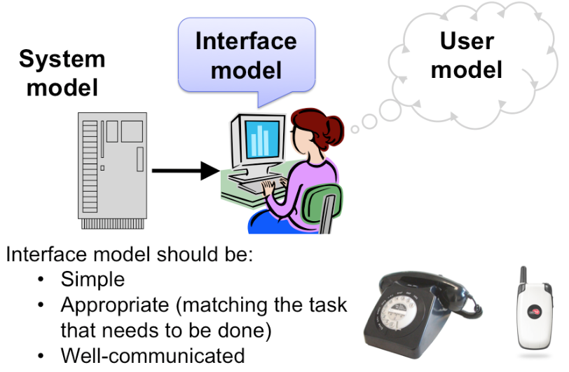 A cell phone presents the same simple interface model as a conventional wired phone, even though its system model is quite a bit more complex. A cell phone conversation may be handed off from one cell tower to another as the user moves around. This detail of the system model is hidden from the user.