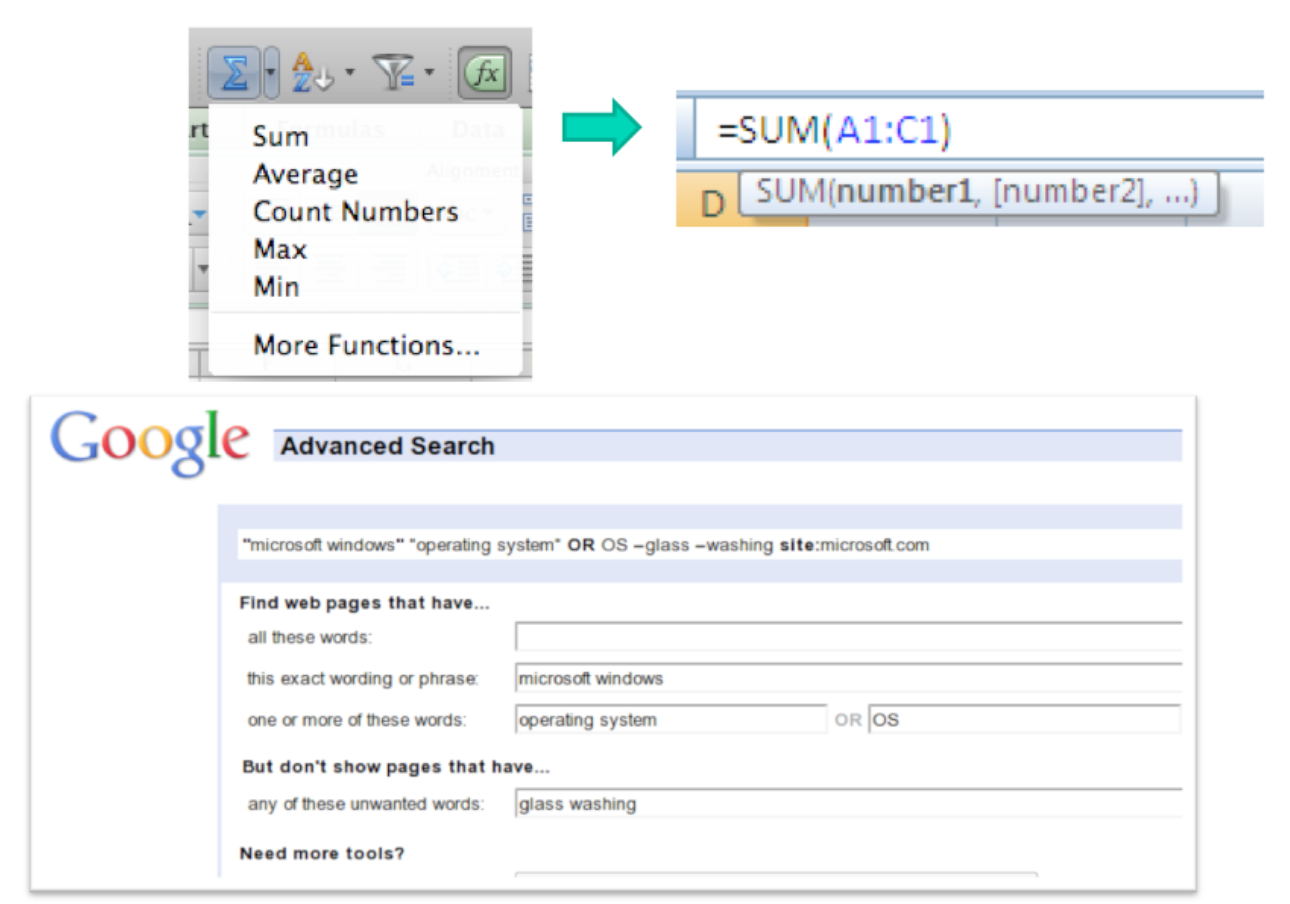 On the bottom is another example of self-disclosure: Google’s Advanced Search form, which allows the user to specify search options by selecting them from menus, the results of which are also displayed as a command based query (microsoft windows operating system OR OS -glass -washing site:microsoft.com) which can be entered on the main search page (example suggested by Geza Kovacs).