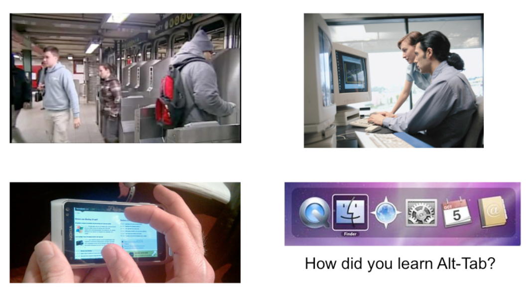 Unfortunately much of our software–whether for desktops, laptops, tablets, or smartphones–is designed for one person, and you don’t often use it together with other people, reducing the opportunities for learning by watching. Yet seeing somebody else do it may well be the only way you can learn about some features that are otherwise invisible. For example, you probably know how to use Alt-Tab to switch between windows. How did you learn that? The UI itself certainly didn’t communicate it to you. Pinch-zooming on smartphones and tablets is similar–but pinch-zooming may have benefited from mass media advertising showing us all how to use it.