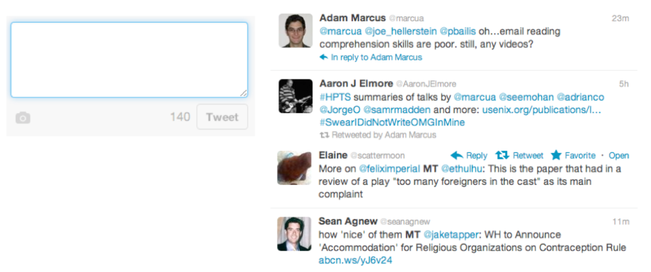 Let’s look at Twitter’s interface–specifically, let’s focus on the interface for creating a new tweet. What aspects of this interface are knowledge in the world, and what aspects require knowledge in the head? In what way is Twitter a hybrid of a command language and a menu/form interface?