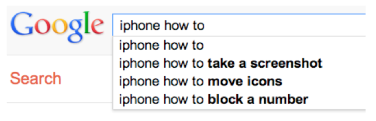 Search engines have become even more important than in-application help systems, however. And a wonderful thing about search engines is that they show us query suggestions, so we can get some insight into the goals of thousands of other users.