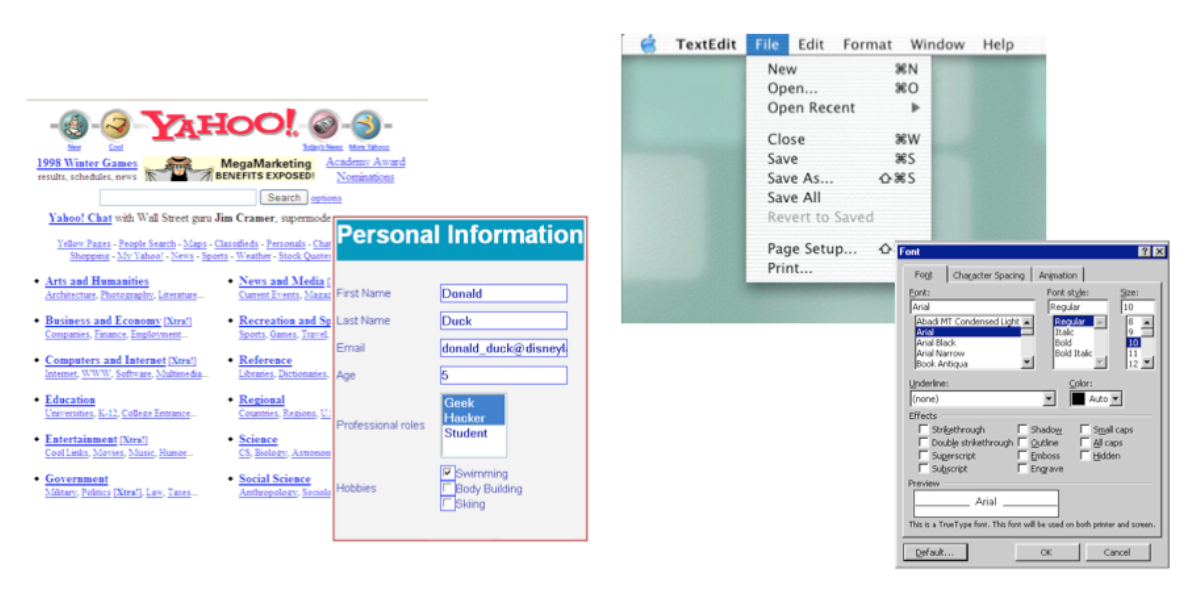 Efficiency: Experts can be very efficient with CL, since they don’t need to wait for and visually scan system prompts, and many CL systems have command histories and scripting facilities that allow commands to be reused rather than constantly retyped. Efficient performance with MF interfaces demands good shortcuts (e.g., keyboard shortcuts, tabbing between form fields, typeahead). Efficient performance with DMs is possible when the DM is appropriate to the task; but using DM for a task it isn’t well-suited for may feel like manual labor with a mouse.
