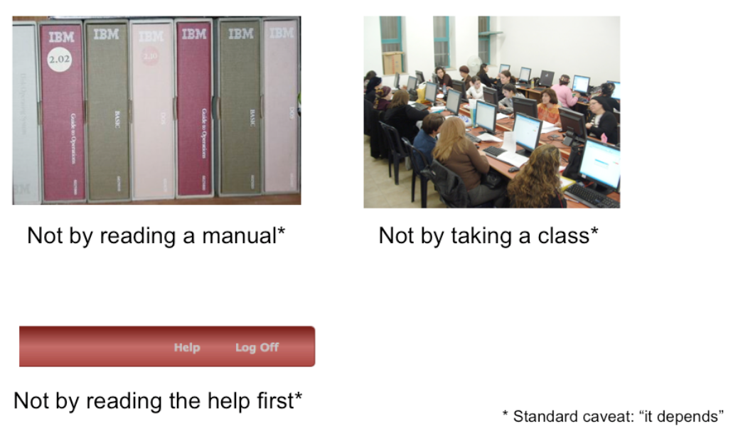 All these statements have to be caveated, because in some circumstances–some applications, some tasks, some users–these might very well be the way the user learns. Very complex, professional-level tools might well be encountered in a formal training situation–that’s how pilots learn how to use in-cockpit software, for example. And some users (very few of them) do read manuals.