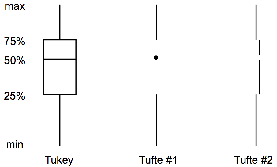 Conversely, here’s a case where simplicity is taken too far, and contrast suffers. Simplicity and contrast seem to fight with each other. The standard Tukey box plot shows 5 different statistics in a single figure. But it has unnecessary lines in it! Following the principle of simplicity to its logical extreme, Edward Tufte proposed two simplifications of the box plot which convey exactly the same information - but at a great cost in contrast. Try the squint test on the Tukey plot, and on Tufte’s second design. What do you see?