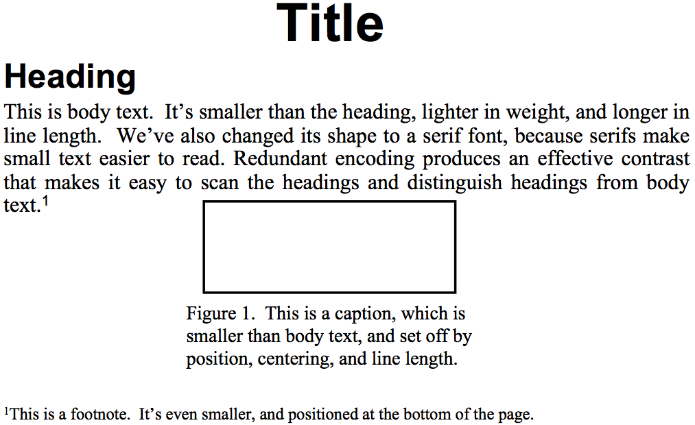 Titles, headings, body text, figure captions, and footnotes show how contrast is used to make articles easier to read. You can do this yourself when you’re writing papers and documentation.