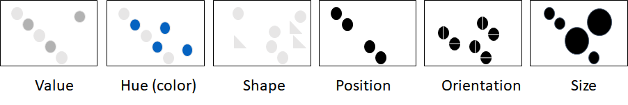 Crucial to this decision is an understanding of the different visual dimensions. Jacques Bertin developed a theory of visual variables that is particularly useful here (Bertin, Graphics and Graphics Information Processing, 1989). Visual variables identified by Bertin are shown in the figure. Bertin called these dimensions retinal variables, in fact, because they can be compared effortlessly without additional cognitive processing, as if the retina were doing all the work.