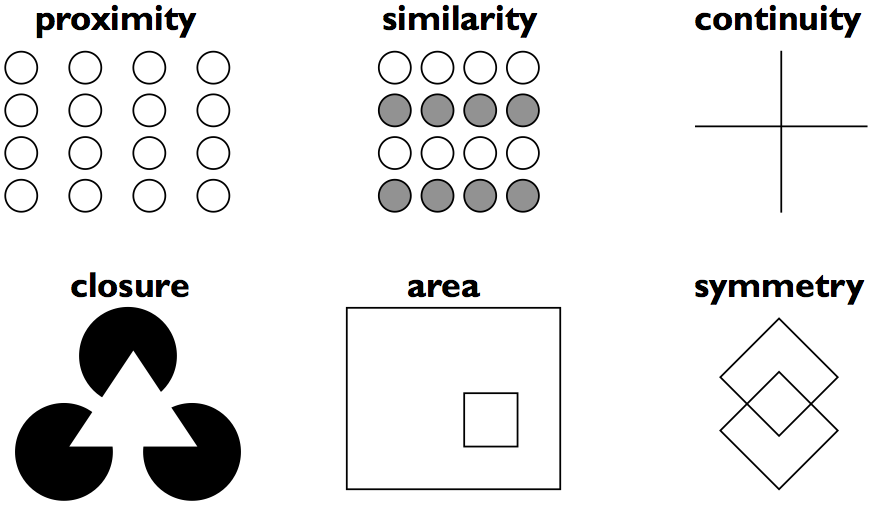 The power of white space for grouping derives from the Gestalt principle of proximity. These principles, discovered in the 1920s by the Gestalt school of psychologists, describe how early visual processing groups elements in the visual field into larger wholes. Here are the six principles identified by the Gestalt psychologists: