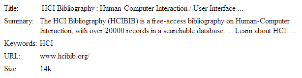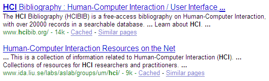 Here’s another example showing how redundant encoding can make an information display easier to scan and easier to use. Search engine results are basically just database records, but they aren’t rendered in a simplistic caption/field display like the one shown on top. Instead, they use rich visual variables (and no field labels!) to enhance the contrast among the items. Page titles convey the most information, so they use size, hue, and value (brightness), plus a little shape (the underline). The summary is in black for good readability, and the URL and size are in green to bracket the summary.