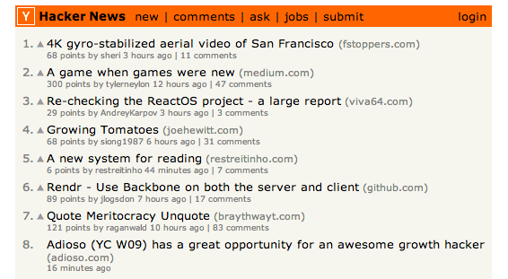 Establish a hierarchy of importance among the elements of your design. One kind of hierarchy is visual: use visual variables to make the more important elements pop out. Hacker News (top) does this effectively and simply. The highest element in the hierarchy is the header bar, which pops out because of its position, its drastically contrasting hue (the only non grayscale on the page!), and value (the boldfaced title in it). The next elements in the hierarchy are the items on the list. Within each item, the most important element is the article title, which pops out. Other data fields of the article have less importance, so they are given less salience.