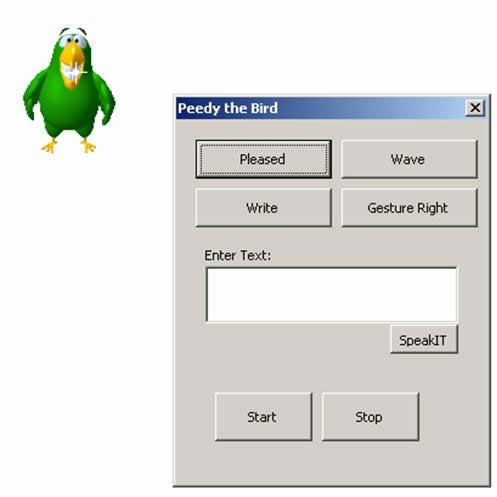 Take some time to experiment with Peedy. Try to get the bird to smile (as in the figure above), and to say things that you type in the text box. If you wear your system's headphones, you should hear Peedy "say" things to you.